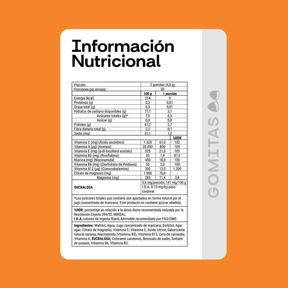 Nuestro Multivitamínico es un complemento alimenticio en gomitas sabor naranja que entrega una combinación de vitaminas y minerales esenciales para apoyar tu energía diaria, el sistema inmune y el buen funcionamiento del organismo.